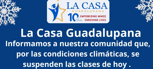 Debido a las condiciones climáticas, La Casa Guadalupana estará cerrada hoy en la tarde ❄️🏠 Las citas de registro han sido reprogramadas para el 15 de diciembre 📅 Agradecemos su comprensión y los invitamos a mantenerse seguros en casa .🤍